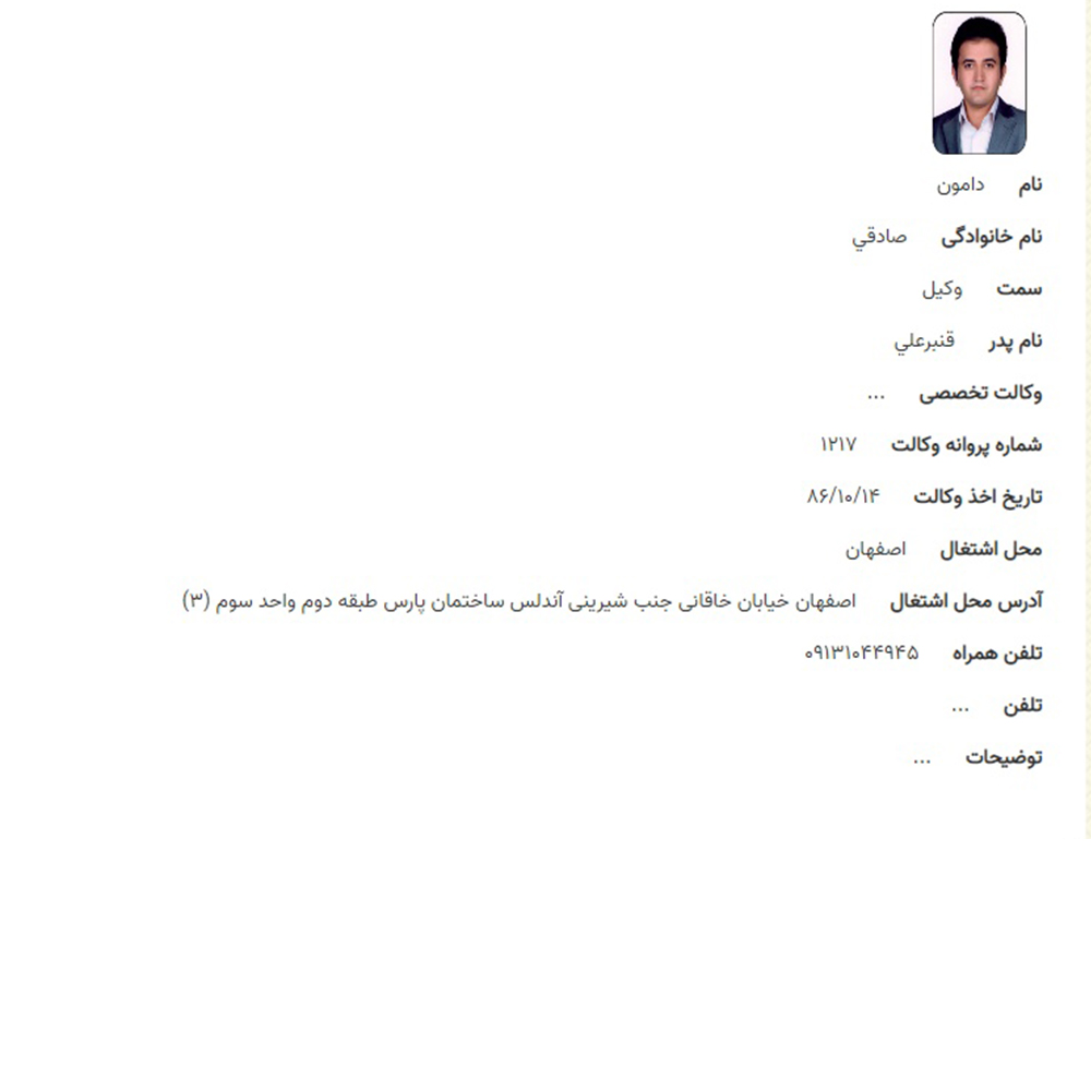 وکیل پایه یک دادگستریآقای صادقی از وکلای خوب اصفهان هستند که سال ها است به ارائه خدمات حقوقی به مردم این شهر می پردازند. ایشان فارغ التحصیل رشته حقوق جزا و جرم شناسی در مقطع کارشناسی ارشد می باشد. وکیل دامون صادقی حدود 16 سال است که در امر وکالت فعالیت می کنند و دعاوی بسیاری را به نتیجه دلخواه موکلین رسانده اند. صداقت، حسن خلق، تعهد و مسئولیت پذیری ایشان سبب جلب اعتماد و رضایت موکلین ایشان شده است.